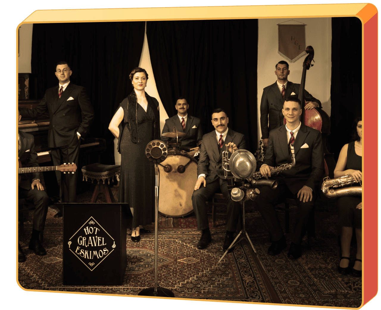 “Hot Gravel Eskimos”, the top-class eight-piece band from Milan led by one of the most representative “hot jazz” specialists in Italy, multi-instrumentalist Mauro L. Porro, relives the pleasure of Classic Jazz tradition through exhilarating live performances of a musical repertoire focused on the original “Swing” music from the 1930s and the beginning of the 1940s.